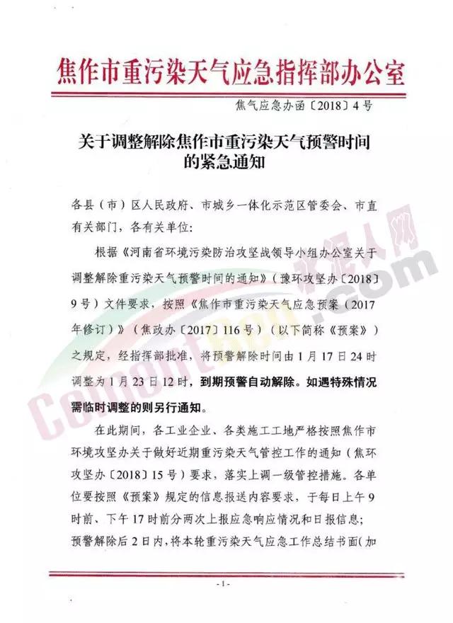 河南焦作:調(diào)整解除焦作市重污染天氣預(yù)警時間
