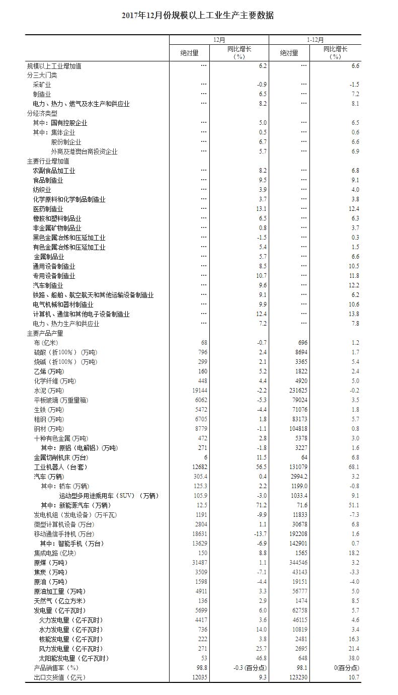 分產(chǎn)品看,12月份,596種產(chǎn)品中有331種產(chǎn)品同比增長。其中,鋼材8779萬噸,同比下降1.1%;水泥19144萬噸,下降2.2%;十種有色金屬472萬噸,增長2.8%;乙烯160萬噸,增長5.2%;汽車305.4萬輛,增長0.4%;轎車125.3萬輛,增長2.2%;發(fā)電量5699億千瓦時,增長6.0%;原油加工量4911萬噸,增長3.3%。