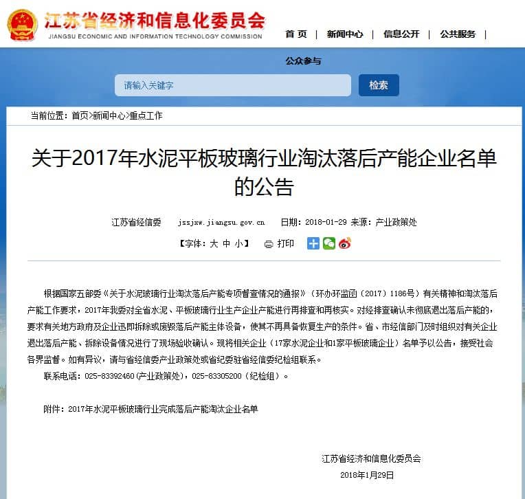 【水泥人網(wǎng)】日前,江蘇省經(jīng)信委發(fā)布關(guān)于2017年水泥平板玻璃行業(yè)淘汰落后產(chǎn)能企業(yè)名單的公告。公告稱:根據(jù)國家五部委《關(guān)于水泥玻璃行業(yè)淘汰落后產(chǎn)能專項(xiàng)督查情況的通報(bào)》有關(guān)精神和淘汰落后產(chǎn)能工作要求,2017年江蘇省工信委對(duì)江蘇省全省水泥行業(yè)生產(chǎn)企業(yè)產(chǎn)能進(jìn)行再排查和再核實(shí)。