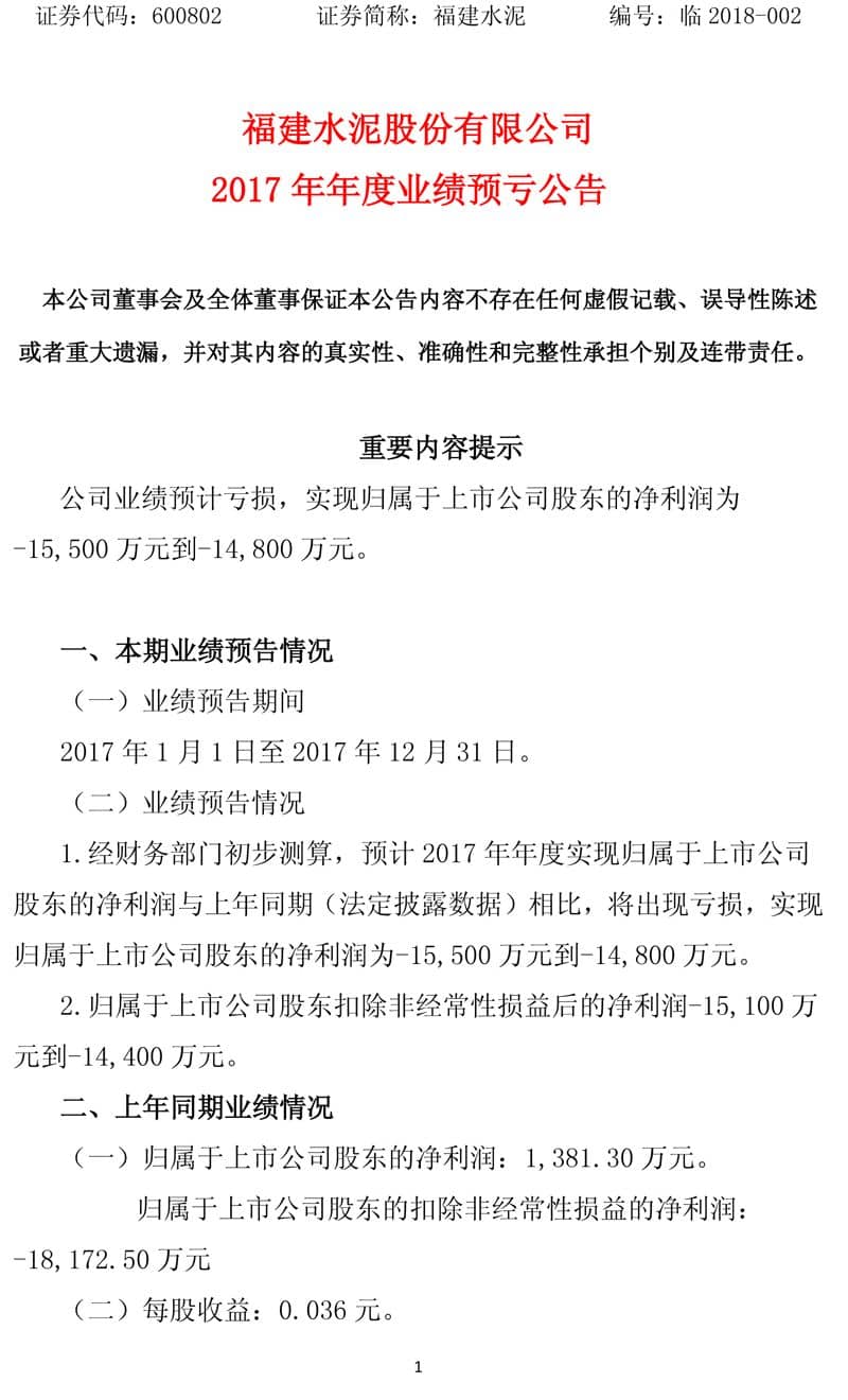 【水泥人網(wǎng)】1月30日,福建水泥(600802)發(fā)布業(yè)績預(yù)告,公司預(yù)計2017年1-12月歸屬上市公司股東的凈利潤-1.55億至-1.48億,同比變動-1222.13%至-1171.45%,建筑材料行業(yè)平均凈利潤增長率為69.21%。