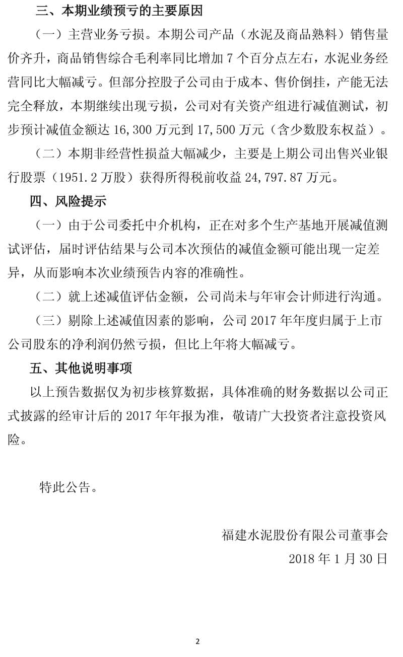 (一)主營業(yè)務(wù)虧損。本期公司產(chǎn)品(水泥及商品熟料)銷售量價齊升,商品銷售綜合毛利率同比增加7個百分點左右,水泥業(yè)務(wù)經(jīng)營同比大幅減虧。但部分控股子公司由于成本、售價倒掛,產(chǎn)能無法完全釋放,本期繼續(xù)出現(xiàn)虧損,公司對有關(guān)資產(chǎn)組進行減值測試,初步預(yù)計減值金額達(dá)16,300萬元到17,500萬元(含少數(shù)股東權(quán)益)。