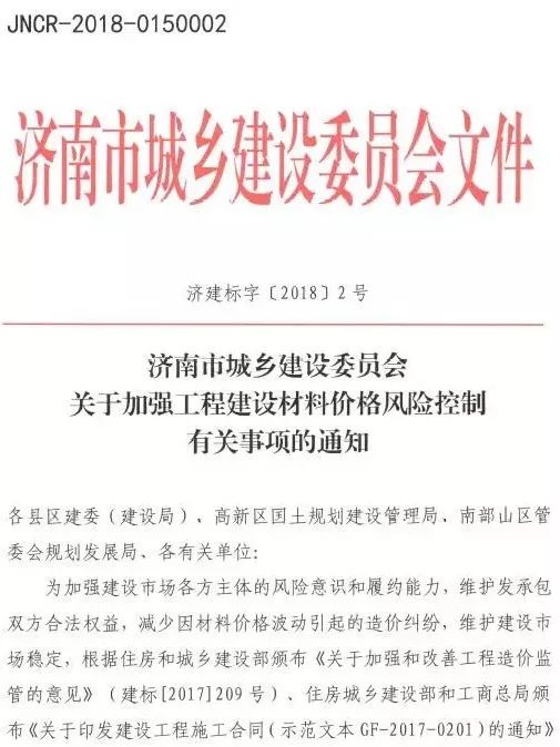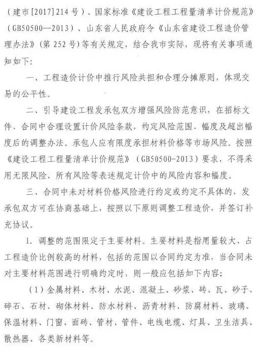 2018年1月30日,濟(jì)南市住建委印發(fā)《關(guān)于加強(qiáng)工程建設(shè)材料價(jià)格風(fēng)險(xiǎn)控制有關(guān)事項(xiàng)的通知》(濟(jì)建標(biāo)字〔2018〕2號(hào)),明確工程計(jì)價(jià)中應(yīng)推行風(fēng)險(xiǎn)共擔(dān)和合理分?jǐn)傇瓌t,承包人應(yīng)有限度承擔(dān)材料價(jià)格等市場(chǎng)風(fēng)險(xiǎn)。