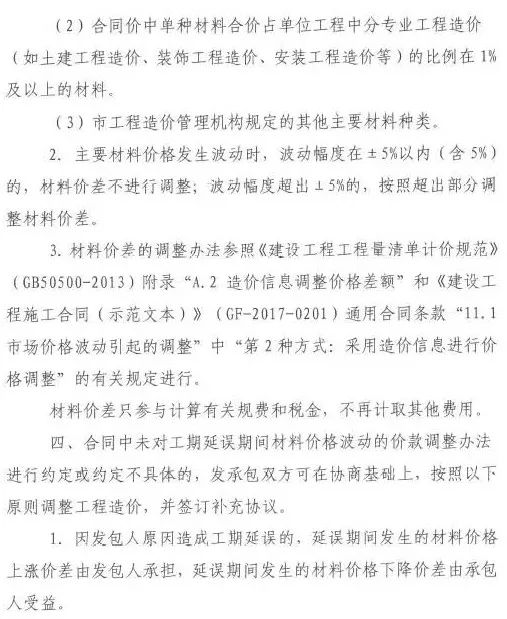 二、發(fā)承包雙方簽訂固定價(jià)格合同,且合同中未對(duì)材料價(jià)格風(fēng)險(xiǎn)幅度以及調(diào)整辦法進(jìn)行約定或約定不具體的,發(fā)承包雙方應(yīng)按照以下原則進(jìn)行協(xié)商、調(diào)整,并簽訂補(bǔ)充條款或補(bǔ)充合同。
