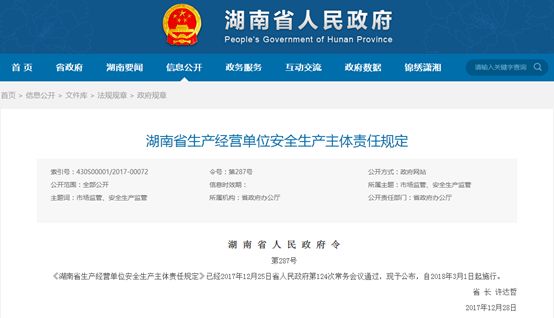 2月27日上午,湖南省發(fā)布了《湖南省生產(chǎn)經(jīng)營(yíng)單位安全生產(chǎn)主體責(zé)任規(guī)定》。標(biāo)志著從3月1日起,將開(kāi)始實(shí)行企業(yè)生產(chǎn)經(jīng)營(yíng)單位負(fù)責(zé)人安全責(zé)任終身追究制度。