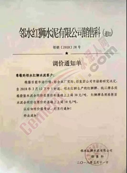 川東區(qū)域主導(dǎo)企業(yè)鄰水紅獅水泥調(diào)價(jià)通知稱:根據(jù)目前市場(chǎng)行情,結(jié)合本廠實(shí)際,經(jīng)集團(tuán)公司市場(chǎng)部研究決定,自3月12日下午5時(shí)起,上調(diào)紅獅牌、錢江牌各規(guī)格袋裝水泥合同價(jià)在原價(jià)的基礎(chǔ)上上調(diào)30元/噸,紅獅牌各規(guī)格散裝水泥合同價(jià)在原價(jià)基礎(chǔ)上上調(diào)50元/噸。通知文原文如下