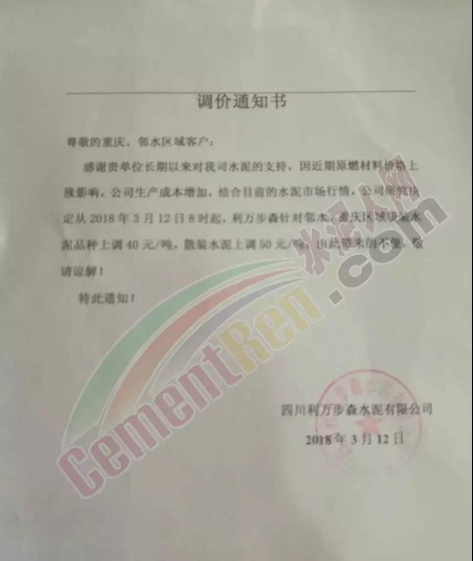另?yè)?jù)水泥人網(wǎng)重慶通訊員消息,自昨日(12日)起,重慶主城區(qū)企業(yè)陸續(xù)發(fā)布通知上調(diào)水泥出廠價(jià),上調(diào)幅度也在30-50元/噸。