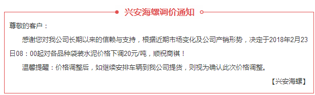 【水泥人網(wǎng)】昨日(18日)興安海螺再次發(fā)布降價(jià)通知,通知稱根據(jù)近期市場變化及公司產(chǎn)銷形勢,決定于2018年3月18日08:00起對52.5、PO42.5散裝水泥價(jià)格分別下調(diào)20元/噸,PC32.5R散裝水泥價(jià)格下調(diào)10元/噸。調(diào)價(jià)通知如下: