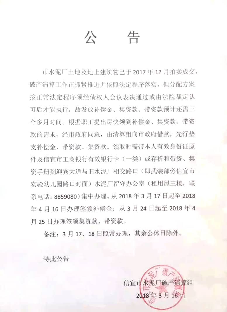 根據(jù)有關(guān)法律、法規(guī),清算組對水泥廠破產(chǎn)后的職工補(bǔ)償情況等進(jìn)行了調(diào)查,并列出職工補(bǔ)償清單于2017年12月21日予以公示和核對。