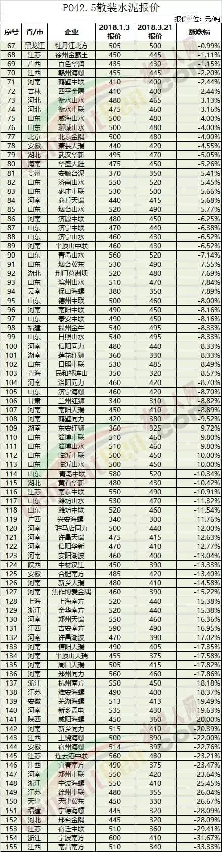 以上數(shù)據(jù)顯示自本年度1月份以來,內(nèi)蒙、遼寧、黑龍江、湖南、陜西、甘肅、新疆、廣東、廣西、云南、重慶、 河北、河南等省自治區(qū)水泥價格均有上調(diào),上調(diào)幅度最高為45%以上。