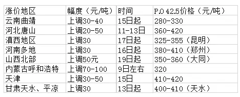 正當(dāng)市場(chǎng)還在消化和觀察近日漲價(jià)通知落實(shí)情況時(shí),20日,有風(fēng)聲傳出東北地區(qū)或25-27日推漲水泥價(jià)格100-150元/噸。東北地區(qū)調(diào)整后42.5散裝水泥出廠掛牌提至450-500元。