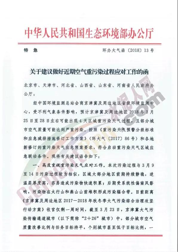 公函文件稱,預計京津冀及周邊地區(qū)2018年3月25日28日左右可能現(xiàn)4天區(qū)域重污染天氣過程,且部分城市空氣質(zhì)量可能達到嚴懲污染。建議北京市、天津市、河北省、山西省、山東省、河南省等高度重視重污染天氣應對工作。