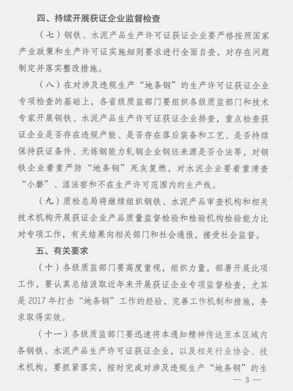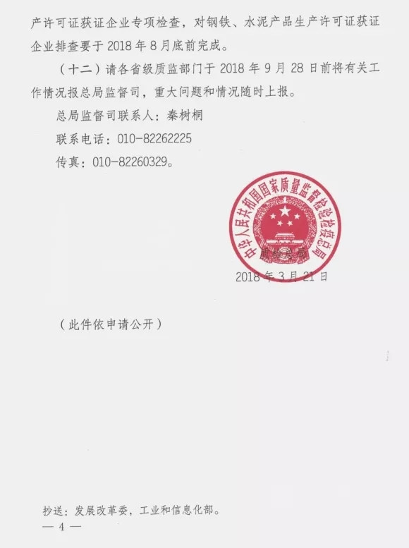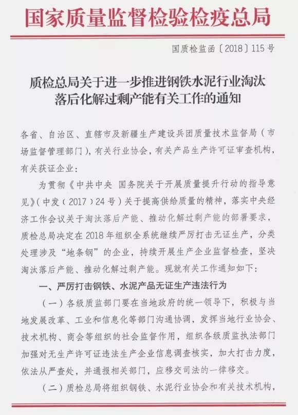 通知稱,為貫徹《中共中央國務院關(guān)于開展質(zhì)量提升行動的指導意見》(中發(fā)[2017]24號文)關(guān)于提高供給質(zhì)量的精神,落實中央經(jīng)濟工作會議關(guān)于淘汰落后產(chǎn)能、推動化解過剩產(chǎn)能的部署要求,國家質(zhì)檢總局決定在2018年組織全系統(tǒng)對水泥生產(chǎn)許可證進行全面排查,繼續(xù)嚴厲打擊無證生產(chǎn),持續(xù)開展生產(chǎn)企業(yè)監(jiān)督檢查工作。