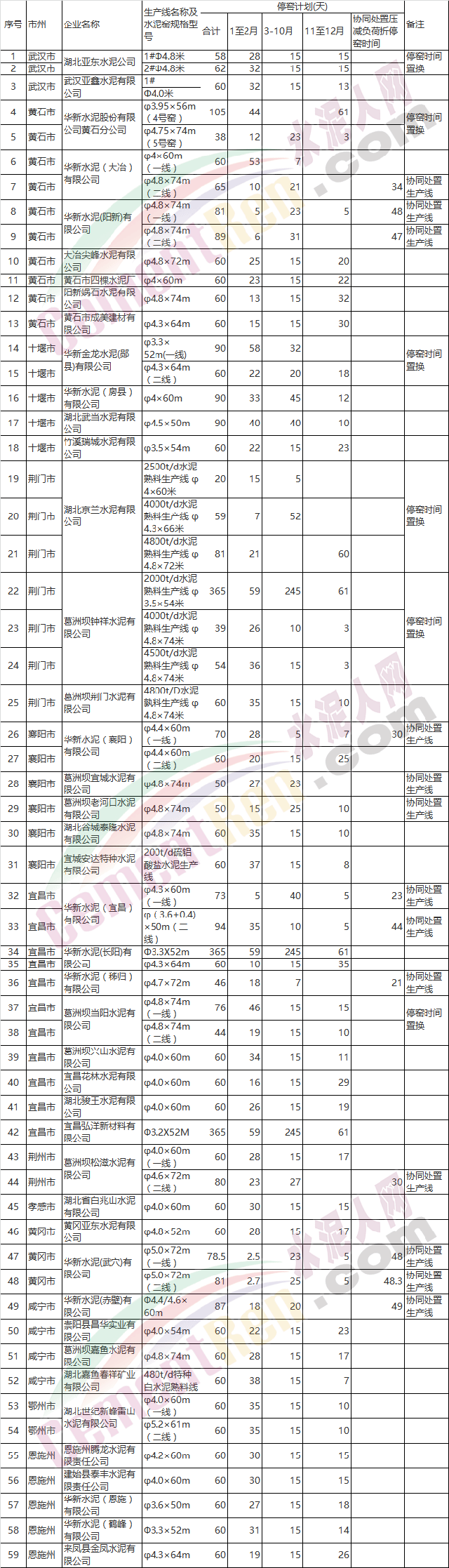 2018年全省水泥企業(yè)錯峰生產(chǎn)計劃匯總表