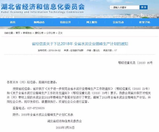【水泥人網(wǎng)】日前,湖北省經(jīng)信委下發(fā)《關于2018年全省水泥企業(yè)錯峰生產(chǎn)計劃的通知》,通知稱按照省經(jīng)信委、省環(huán)保廳《關于進一步規(guī)范全省水泥行業(yè)錯峰生產(chǎn)工作的通知》(鄂經(jīng)信重化〔2018〕21號)和《關于全省水泥行業(yè)錯峰生產(chǎn)工作的補充通知》(鄂經(jīng)信重化函〔2018〕39號)要求,湖北省工信委會同省環(huán)保廳對相關市(州)審核上報的水泥企業(yè)2018年錯峰生產(chǎn)備案計劃進行了審定,編制了2018年全省水泥企業(yè)錯峰生產(chǎn)計劃,并向社會公開。