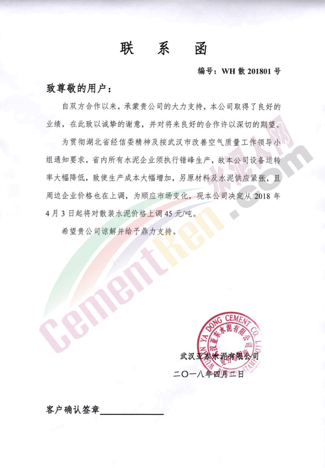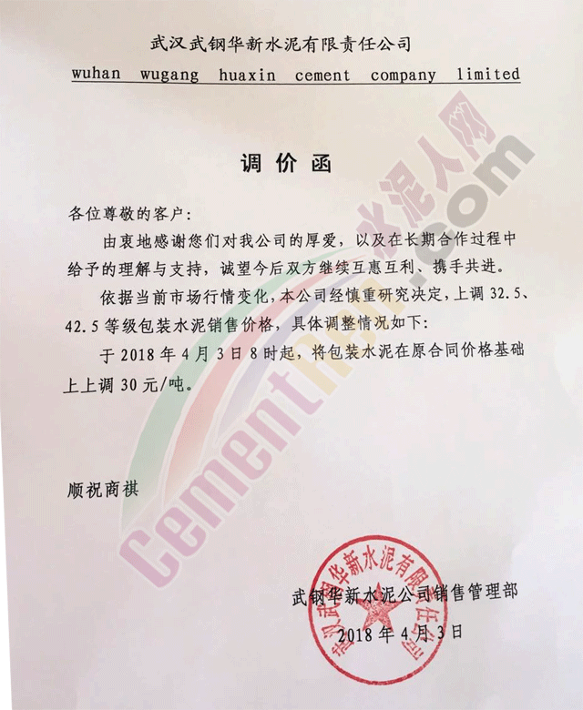 隨著錯峰生產(chǎn)計劃發(fā)布,湖北武漢周邊區(qū)域的華新水泥、亞東水泥、媧石水泥、三峽水泥等企業(yè)發(fā)通知上調(diào)水泥價格,其中袋裝水泥上調(diào)30元/噸,散裝水泥上調(diào)45元/噸。調(diào)價函如下: