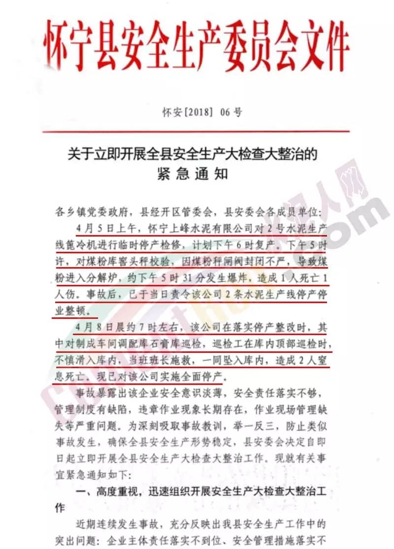 4月8日晨,約7時(shí)左右,該公司在落實(shí)停產(chǎn)整改時(shí),其中對(duì)制成車(chē)間調(diào)配庫(kù)石膏庫(kù)巡檢,巡檢工在庫(kù)內(nèi)頂部巡檢時(shí),不慎滑入庫(kù)內(nèi),當(dāng)班班長(zhǎng)施救,一同墜入庫(kù)內(nèi),造成2人窒息死亡,現(xiàn)已對(duì)該公司實(shí)施全面停產(chǎn)。