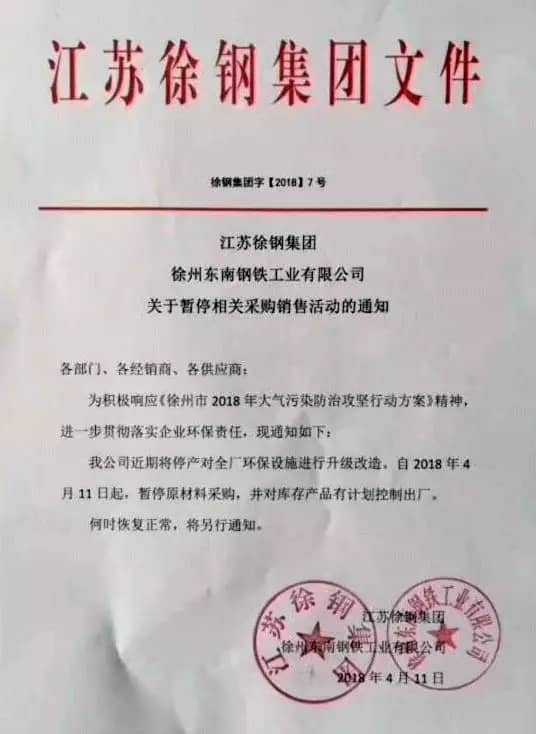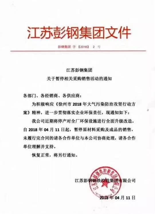 【水泥人網(wǎng)】4月11日徐鋼集團(tuán)徐州東南鋼鐵工業(yè)有限公司和江蘇彭鋼鋼鐵控股集團(tuán)有限公司發(fā)布關(guān)于暫停相關(guān)銷售活動(dòng)的通知,通知稱近期將停產(chǎn)對全廠環(huán)保設(shè)施進(jìn)行升級技改,自4月11日起,暫停原材料采購,并對庫存產(chǎn)品有計(jì)劃控制出廠,恢復(fù)時(shí)間將另行通知。