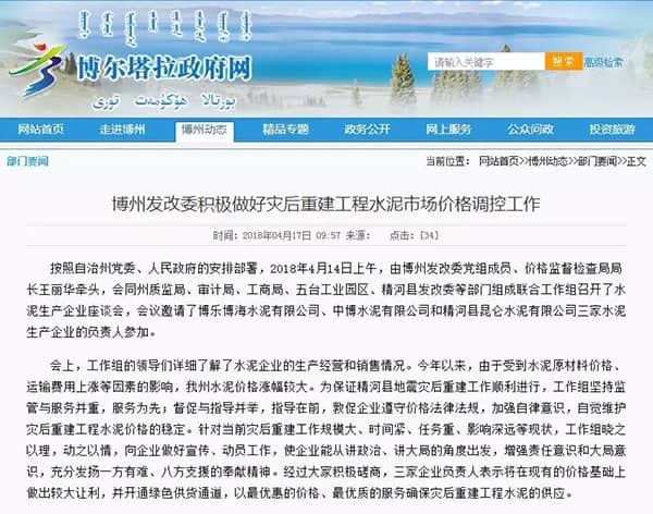 按照新疆博爾塔拉蒙古自治州黨委、人民政府的安排部署,2018年4月14日上午,由博州發(fā)改委黨組成員、價格監(jiān)督檢查局局長王麗華牽頭,會同州質(zhì)監(jiān)局、審計局、工商局、五臺工業(yè)園區(qū)、精河縣發(fā)改委等部門組成聯(lián)合工作組召開了水泥生產(chǎn)企業(yè)座談會,會議邀請了博樂博海水泥有限公司、中博水泥有限公司和精河縣昆侖水泥有限公司三家水泥生產(chǎn)企業(yè)的負(fù)責(zé)人參加。