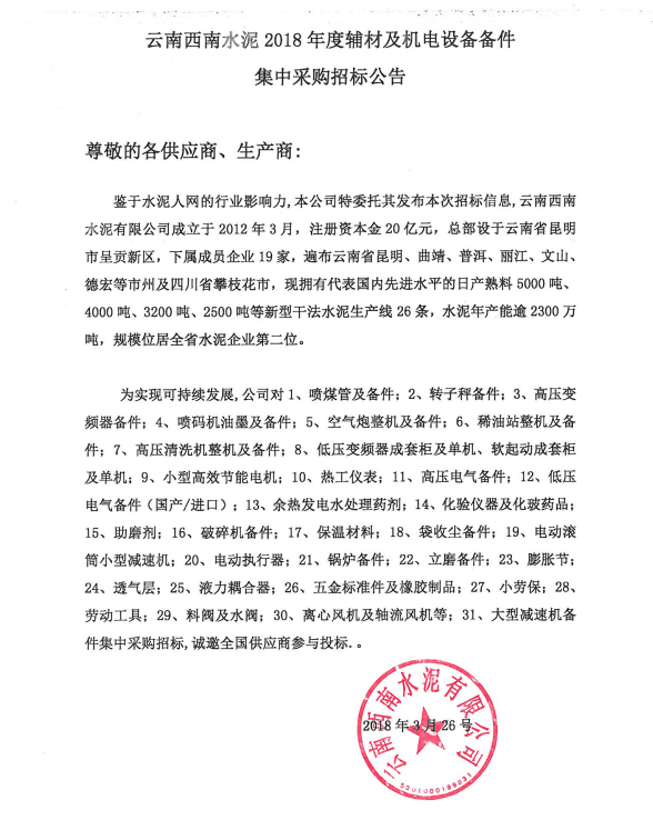 鑒于水泥人網(wǎng)的行業(yè)影響力,本公司特委托其發(fā)布本次招標信息,云南西南水泥有限公司成立于2012年3月,注冊資本金20億元,總部設(shè)于云南省昆明市呈貢新區(qū),下屬成員企業(yè)19家,遍布云南省昆明、曲靖、普洱、麗江、文山、德宏等市州及四川省攀枝花市,現(xiàn)擁有代表國內(nèi)先進水平的日產(chǎn)熟料5000噸、4000噸、3200噸、2500噸等新型干法水泥生產(chǎn)線26條,水泥年產(chǎn)能逾2300萬噸,規(guī)模位居全省水泥企業(yè)第二位。