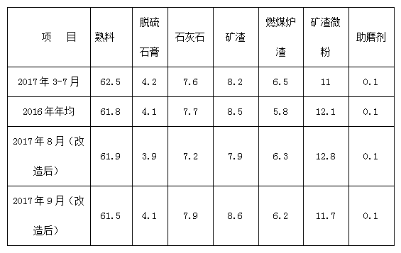 從上表看出:在改造前后物料配比變換不大。助磨劑使用大連萬(wàn)象公司的助磨劑,質(zhì)量沒(méi)有變化。
