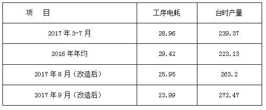 通過(guò)上表可以看出:8月份,改造前后水泥臺(tái)時(shí)增加23.83噸/小時(shí)電耗下降3.01度/噸。9月份改造前后增加33.1噸/小時(shí),電耗下降4.97度/噸,提產(chǎn)降耗效果明顯。