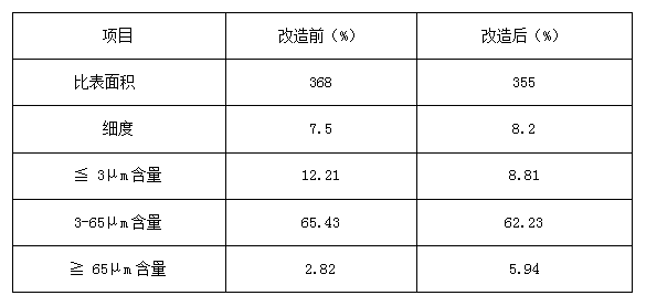 從上表可以看出:改造前后≦ 3μm含量降低了3.4%,3-65μm含量降低了3.2%,≧ 65μm含量 增加了3.12%,比表面積降低了13m2/g.