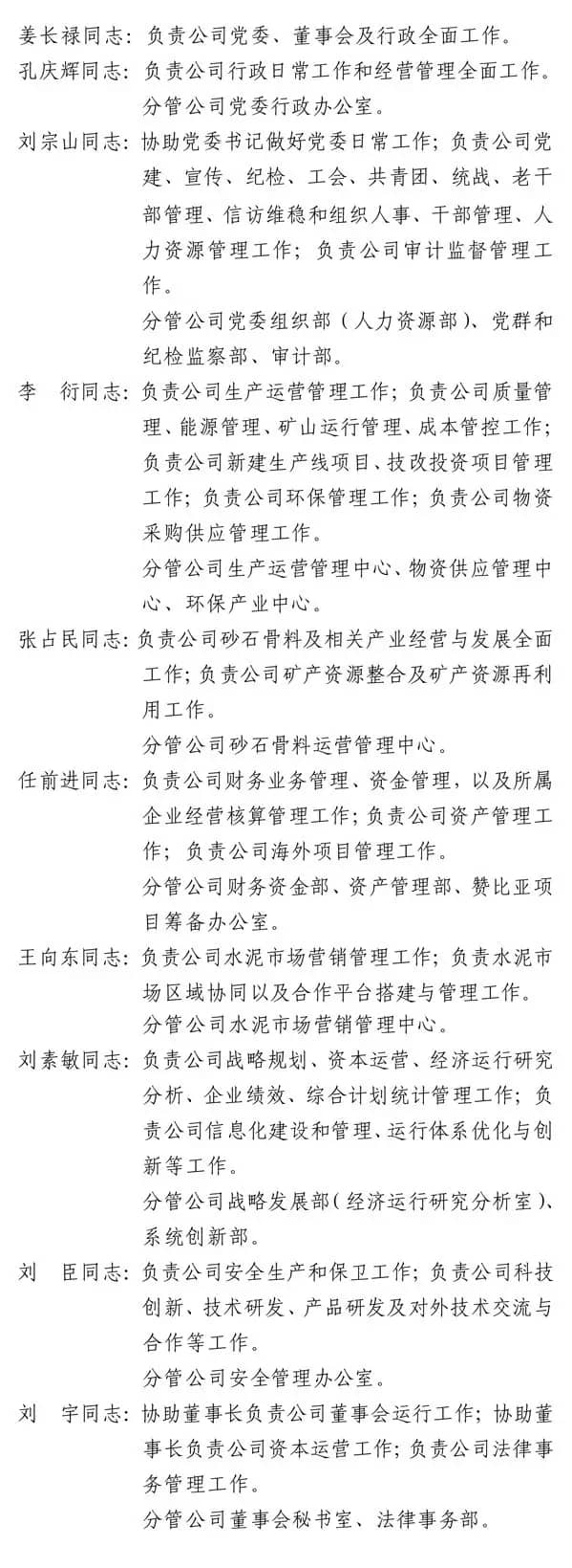 姜長祿:男,漢族,1965年5月出生,北京科技大學(xué)畢業(yè),工學(xué)碩士,高級(jí)經(jīng)濟(jì)師,中共黨員。1987年8月至2005年11月歷任北京市琉璃河水泥廠技術(shù)科監(jiān)督員、原料車間技術(shù)員、新線分廠操作員、生產(chǎn)安全處副處長、運(yùn)輸公司副經(jīng)理、供應(yīng)處處長和支部書記、生產(chǎn)管理部副部長和總調(diào)度長、供應(yīng)部長、副廠長(其間1989年5月至1990年9月伊拉克巴杜什水泥廠操作員);2005年11月至2011年5月歷任北京金隅集團(tuán)股份有限公司水泥事業(yè)部副部長、部長,水泥分公司副經(jīng)理,北京金隅水泥經(jīng)貿(mào)有限公司經(jīng)理,河北太行水泥股份有限公司副總經(jīng)理、董事長;2011年5月至2015年10月歷任北京金隅集團(tuán)股份有限公司水泥事業(yè)部部長、北京金隅水泥經(jīng)貿(mào)有限公司經(jīng)理;2015年10月至2016年5月歷任北京金隅集團(tuán)股份有限公司總經(jīng)理助理、水泥事業(yè)部部長、北京金隅水泥經(jīng)貿(mào)有限公司經(jīng)理;2016年5月至2017年9月歷任北京金隅集團(tuán)股份有限公司黨委常委、副總經(jīng)理、水泥事業(yè)部部長、北京金隅水泥經(jīng)貿(mào)有限公司經(jīng)理,唐山冀東水泥股份有限公司黨委書記、副董事長。2017年9月至今任北京金隅集團(tuán)股份有限公司黨委常委、副總經(jīng)理;2017年9月至今任唐山冀東水泥股份有限公司黨委書記、董事長。