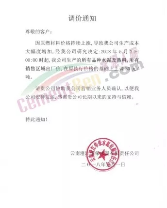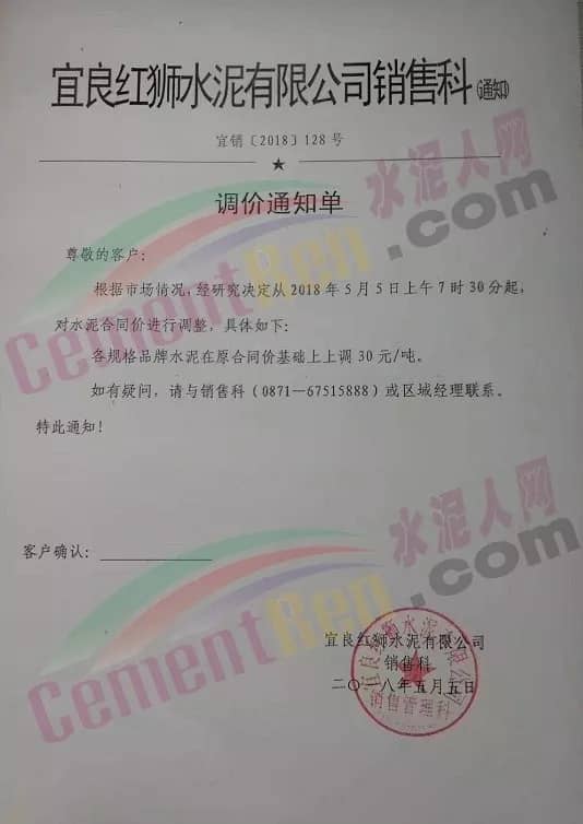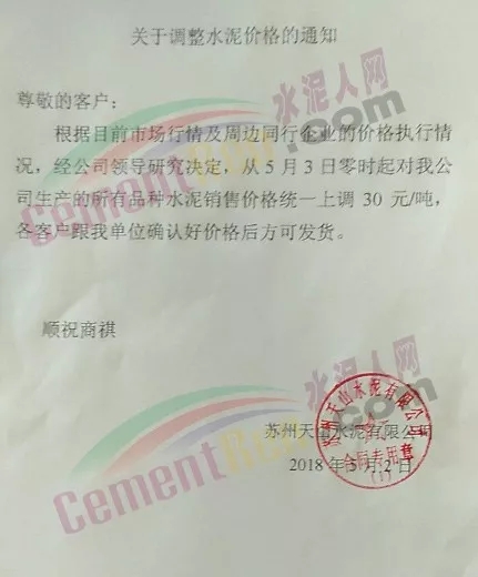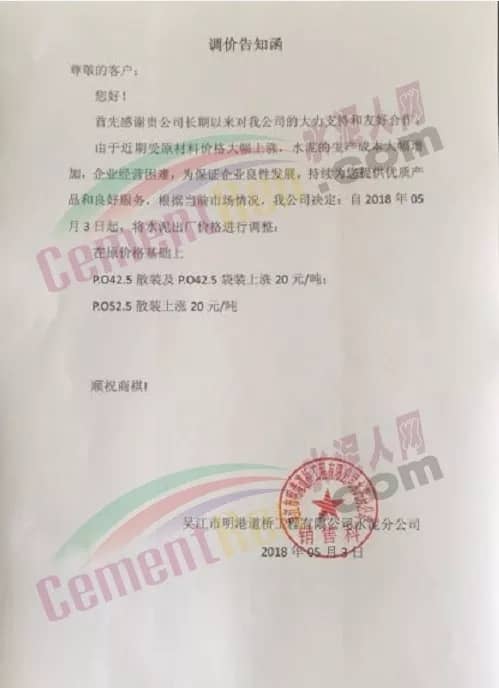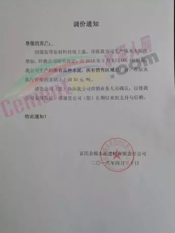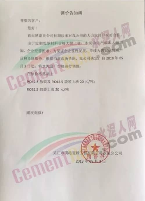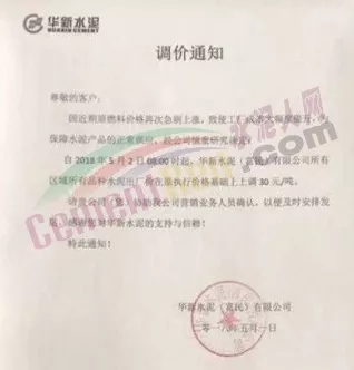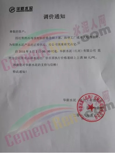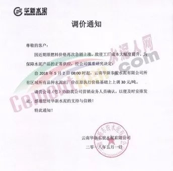華新水泥發(fā)布調(diào)價通知稱,因近期熟料等原材料價格急劇上漲,致使工廠成本大幅度上升,為保障水泥產(chǎn)品的正常供應(yīng),自2018年5月2日起各品種水泥在原執(zhí)行價格基礎(chǔ)上上調(diào)30元/噸。