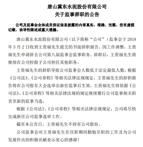 【水泥人網(wǎng)】唐山冀東水泥股份有限公司(簡稱冀東水泥)3日晚間公告稱,該公司監(jiān)事會于2018年5月2日收到王貴福提交的書面辭職報告。因工作調(diào)整,王貴福申請辭去該公司第八屆監(jiān)事會監(jiān)事職務(wù)。辭職后,王貴福將繼續(xù)在該公司控股子公司擔(dān)任其他職務(wù)。