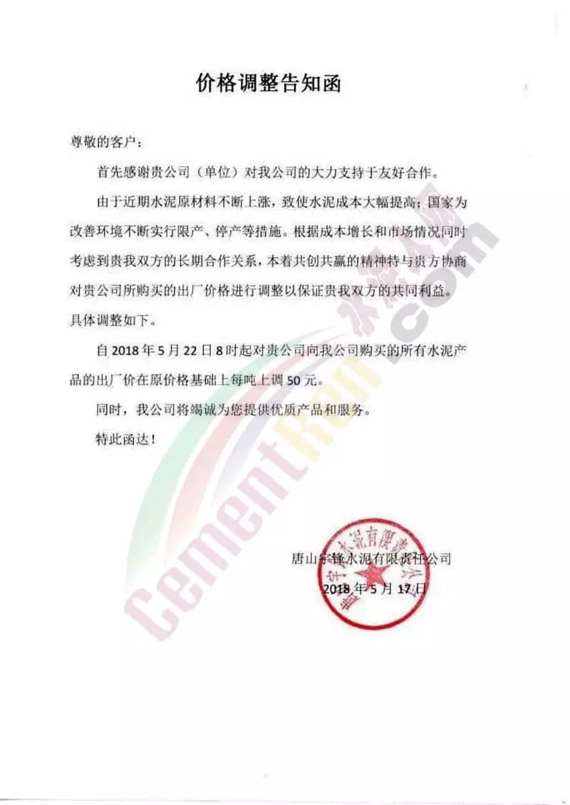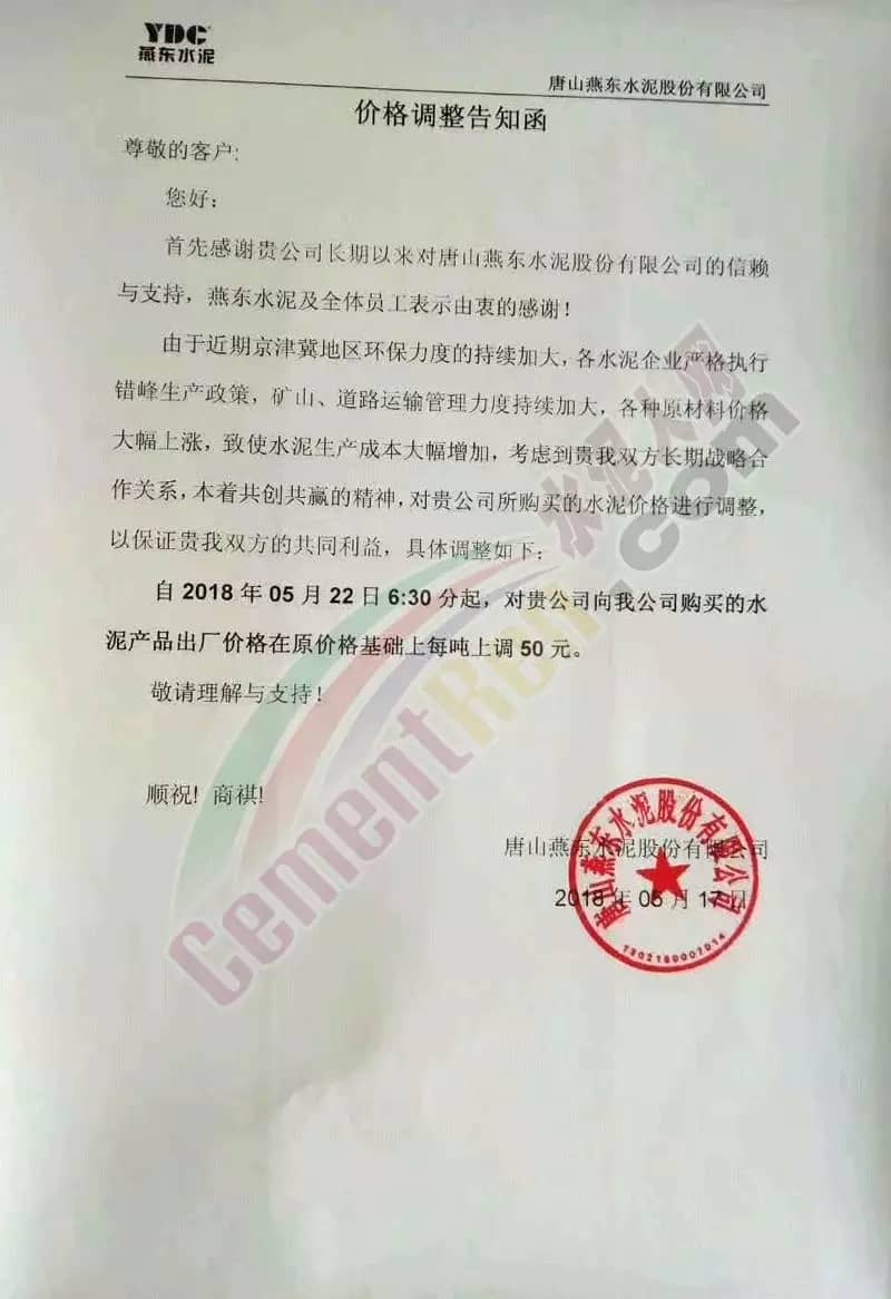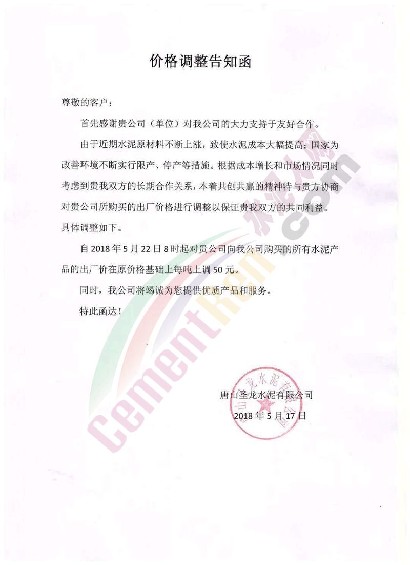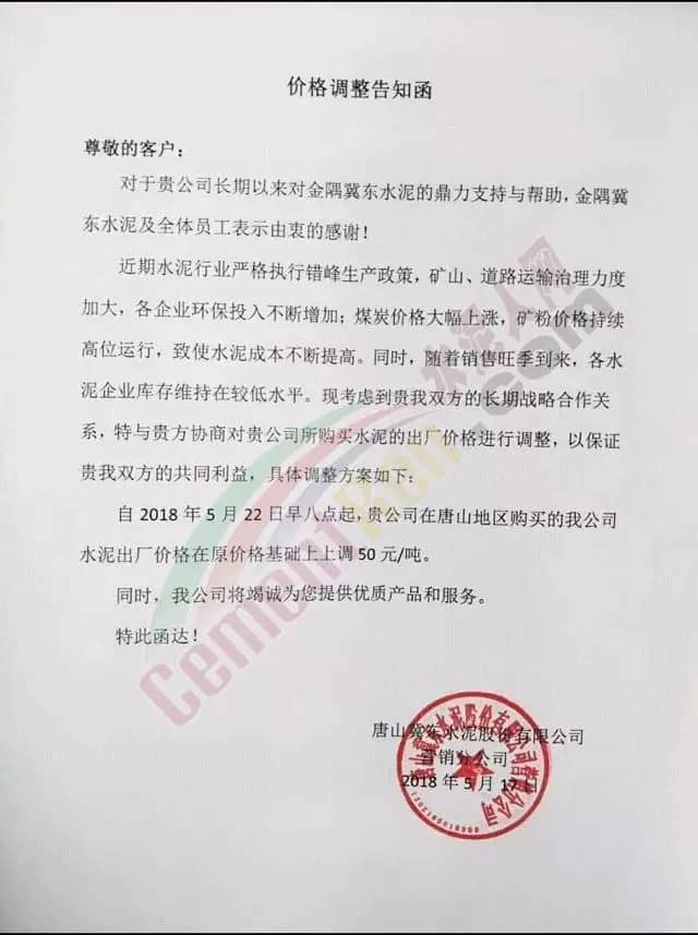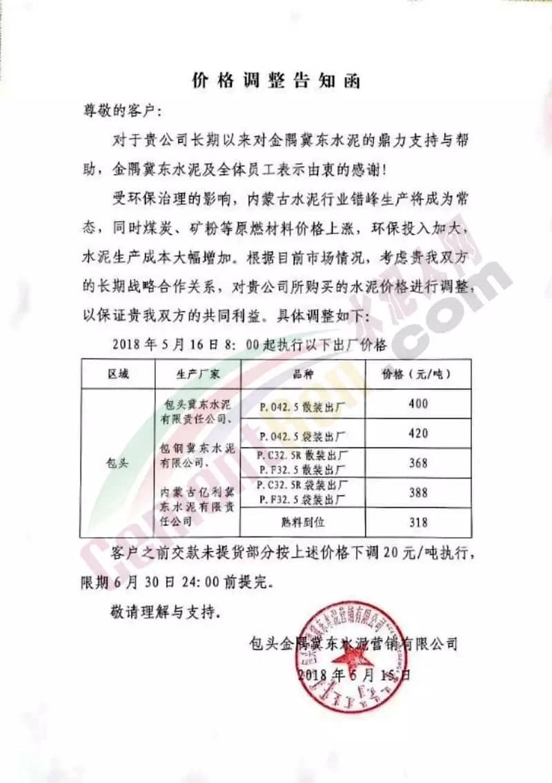 5月16日內(nèi)蒙古自治區(qū)呼和浩特市區(qū)域主導(dǎo)企業(yè)上調(diào)水泥價(jià)格同時(shí)包頭冀東金隅水泥也發(fā)通知上調(diào)水泥價(jià)格。