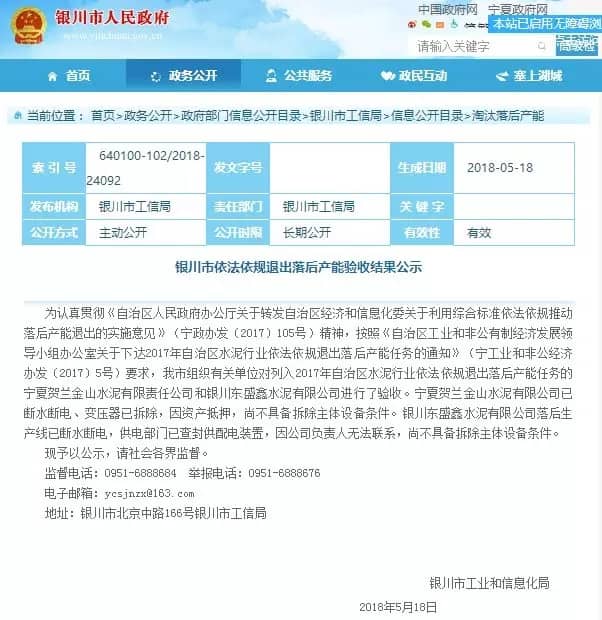 【水泥人網(wǎng)】日前,銀川市工業(yè)和信息化局發(fā)布了《銀川市依法依規(guī)退出落后產(chǎn)能驗收結(jié)果公示》,公示稱為認真貫徹《自治區(qū)人民政府辦公廳關(guān)于轉(zhuǎn)發(fā)自治區(qū)經(jīng)濟和信息化委關(guān)于利用綜合標(biāo)準(zhǔn)依法依規(guī)推動落后產(chǎn)能退出的實施意見》(寧政辦發(fā)〔2017〕105號)精神,按照《自治區(qū)工業(yè)和非公有制經(jīng)濟發(fā)展領(lǐng)導(dǎo)小組辦公室關(guān)于下達2017年自治區(qū)水泥行業(yè)依法依規(guī)退出落后產(chǎn)能任務(wù)的通知》(寧工業(yè)和非公經(jīng)濟辦發(fā)〔2017〕5號)要求,銀川市組織有關(guān)單位對列入2017年自治區(qū)水泥行業(yè)依法依規(guī)退出落后產(chǎn)能任務(wù)的寧夏賀蘭金山水泥有限責(zé)任公司和銀川東盛鑫水泥有限公司進行了驗收。