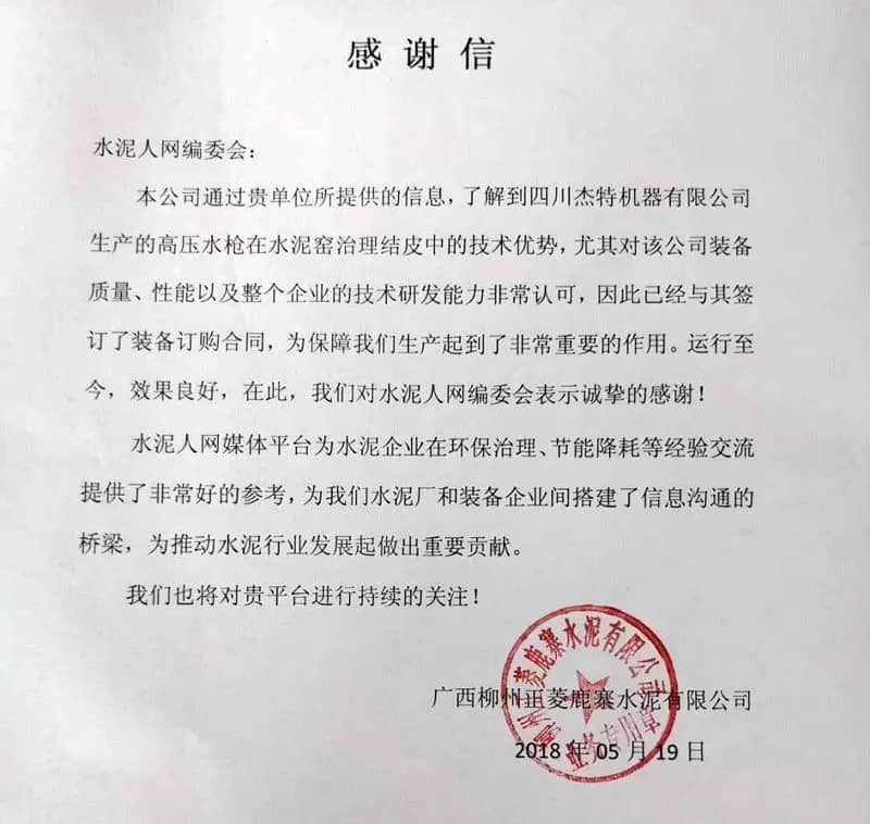 正菱鹿寨水泥負(fù)責(zé)人表示:通過水泥人網(wǎng)介紹的四川杰特機(jī)器有限公司的產(chǎn)品對正菱鹿寨水泥的生產(chǎn)起到了很大的推動作用。