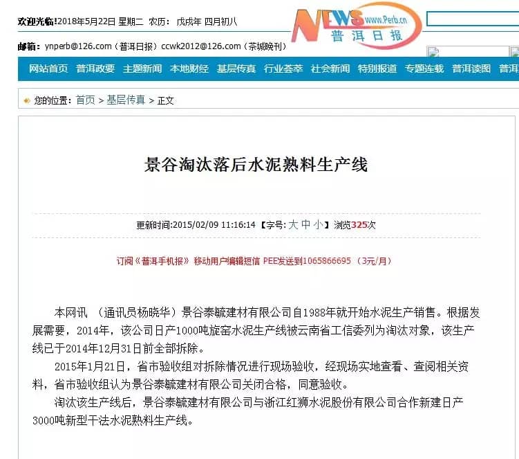 另?yè)?jù)《普洱日?qǐng)?bào)》2015年2月9日消息,景谷泰毓建材有限公司原生產(chǎn)線建設(shè)規(guī)模為日產(chǎn)1000噸旋窯水泥生產(chǎn)線。在2014年被列為淘汰對(duì)象,于2014的12月31日前全部拆除。且于2015年1月驗(yàn)收通過。淘汰該生產(chǎn)線后景谷泰毓建材有限公司與浙江紅獅水泥股份有限公司合作新建日產(chǎn)3000噸新型干法水泥熟料生產(chǎn)線。