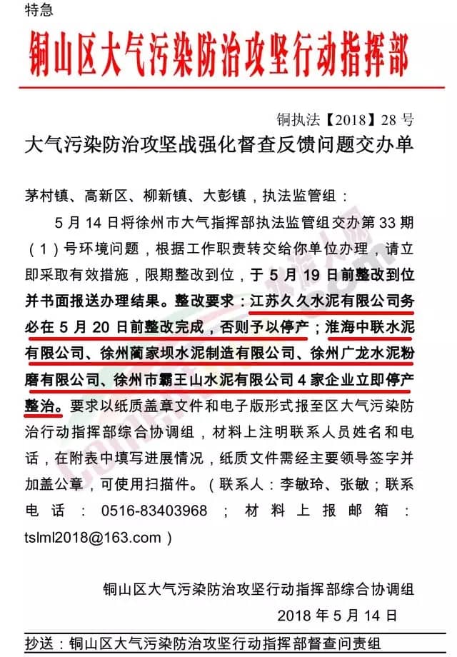 淮海中聯(lián)水泥有限公司、徐州藺家壩水泥制造有限公司、徐州廣龍水泥粉磨有限公司、徐州市霸王山水泥有限公司4家企業(yè)立即停產(chǎn)整治。