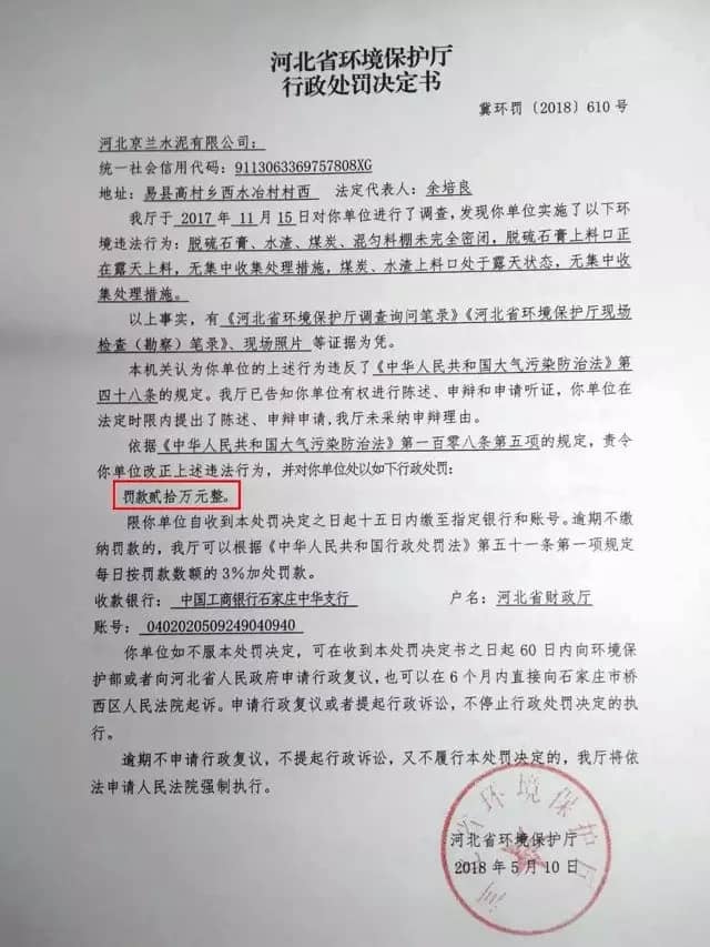 ↑↑↑ 河北京蘭水泥被罰款貳拾萬(wàn)元整
