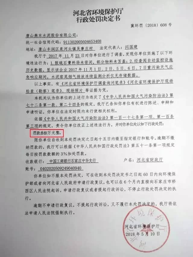 ↑↑↑ 唐山燕東水泥被處罰叁拾萬(wàn)元整