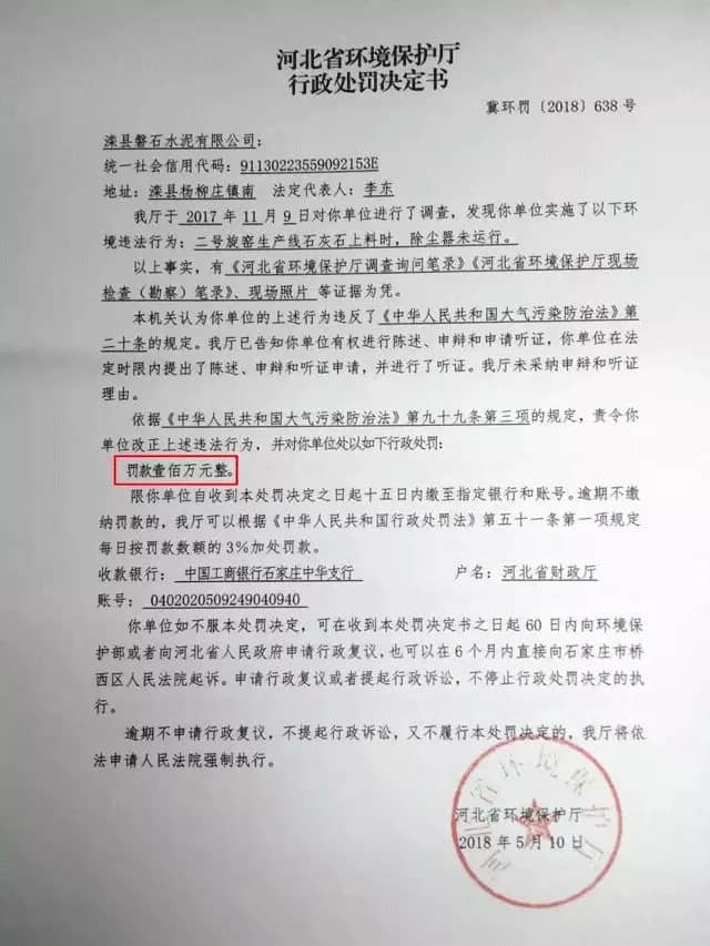 ↑↑↑ 灤縣磐石水泥被處罰壹佰萬(wàn)元整