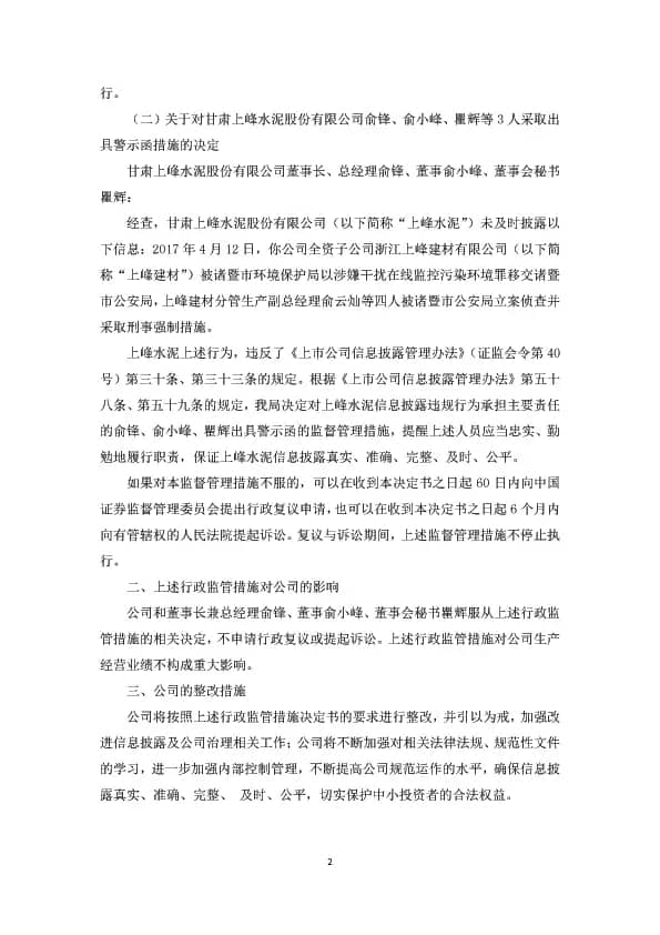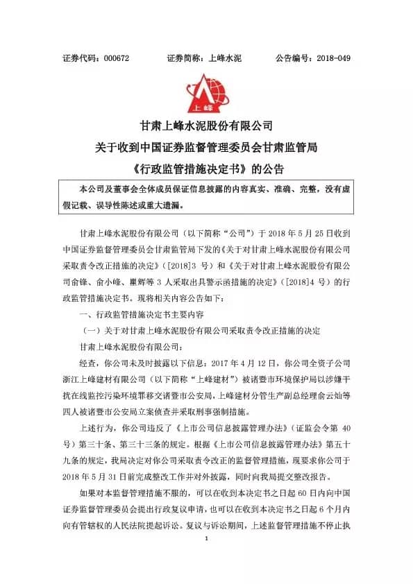 【水泥人網(wǎng)】上峰水泥28日早間公告,公司于5月25日收到中國(guó)證券監(jiān)督管理委員會(huì)甘肅監(jiān)管局下發(fā)的《關(guān)于對(duì)甘肅上峰水泥股份有限公司采取責(zé)令改正措施的決定》([2018]3號(hào))和《關(guān)于對(duì)甘肅上峰水泥股份有限公司俞鋒、俞小峰、瞿輝等3人采取出具警示函措施的決定》([2018]4號(hào))的行政監(jiān)管措施決定書。
