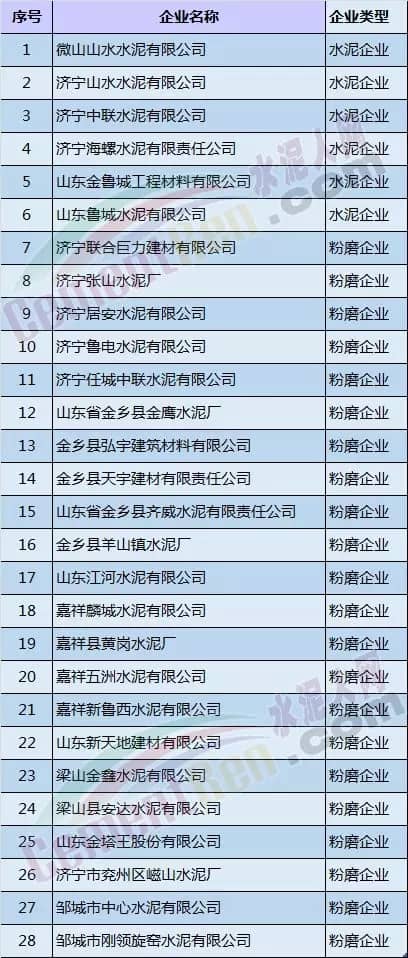 濟寧市部分水泥企業(yè)名單