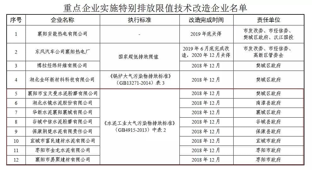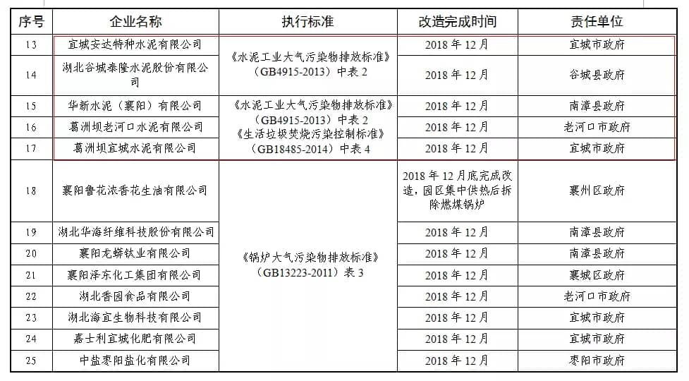 重點(diǎn)企業(yè)實(shí)施特別排放限值技術(shù)改造企業(yè)名單中包括多家水泥企業(yè),改造執(zhí)行標(biāo)準(zhǔn)為《水泥工業(yè)大氣污染物排放標(biāo)準(zhǔn)》(GB4915-2013)中表2。改造完成時間為2018年12月。