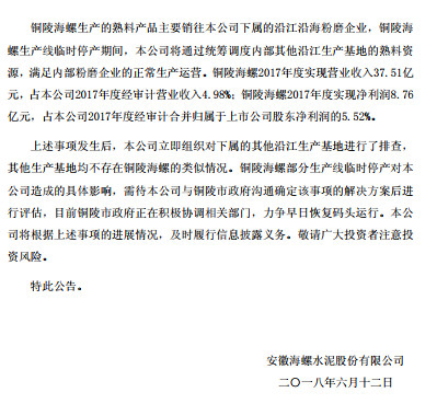 海螺水泥(600585)12日晚公告,全資子公司銅陵海螺收到通知,由于銅陵海螺碼頭處于當?shù)厮畯S取水口二級保護區(qū)范圍內(nèi),將據(jù)生態(tài)環(huán)境部等下發(fā)文件予以清理整治。