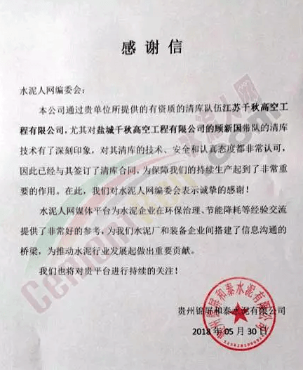作為行業(yè)最大的新媒體平臺(tái),水泥人網(wǎng)每天通過線上線下發(fā)出大量信息,亦收到諸多反饋。日前,水泥人網(wǎng)信息平臺(tái)收到貴州錦屏和泰水泥有限公司發(fā)來的感謝信稱,通過水泥人網(wǎng)所提供的有資質(zhì)的清庫隊(duì)伍江蘇千秋高空工程有限公司,對(duì)其公司顧新國(guó)帶隊(duì)的清庫技術(shù)有了深刻的印象。對(duì)其清庫技術(shù),安全和認(rèn)真態(tài)度都非常認(rèn)可。為保障企業(yè)的持續(xù)生產(chǎn)起到了非常重要的作用,故對(duì)水泥人網(wǎng)表示感謝。