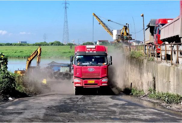 在費(fèi)龍口村督查時(shí),督查人員發(fā)現(xiàn)金華江沿岸有兩座碼頭,分別用于煤炭、砂石裝卸運(yùn)輸,大貨車出入頻繁,現(xiàn)場(chǎng)道路布滿灰塵煤渣,車輛駛過(guò)揚(yáng)塵明顯,場(chǎng)地上煤炭、沙石隨意堆放,無(wú)任何防塵措施。督查組現(xiàn)場(chǎng)盤問(wèn)了相關(guān)情況,對(duì)存在問(wèn)題進(jìn)行記錄,并拍攝了揚(yáng)塵實(shí)況。