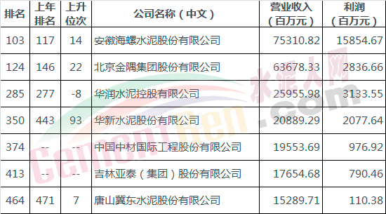 今年落榜的兩家為中國建材和葛洲壩集團,新上榜企業(yè)為中材國際和吉林亞泰集團。今年上榜的企業(yè)多數(shù)較上年排名有所提前。其中海螺水泥從117名上升至103名,上升了14個名次,位于水泥板塊第一位。以此速度明年渴望入圍百名之內(nèi)。上升名次最快的屬華新水泥,一躍升至第350位,躍位近百名。唯一遺憾的華潤水泥自277名落至285名。