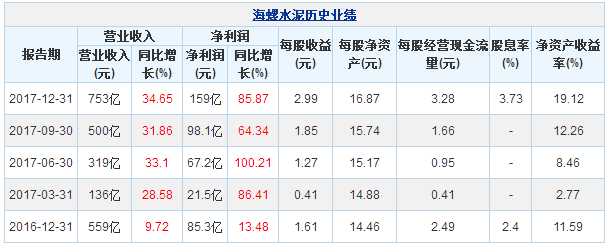 海螺水泥3月23日最新公布的2017年年報顯示,其營業(yè)收入753億元,同比增長34.65%;歸屬于上市公司股東的凈利潤159億元,同比增長85.87%?;久抗墒找?.99元。