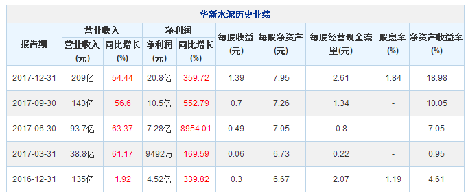 2017年,華新積極貫徹執(zhí)行國家在供給側(cè)結(jié)構(gòu)性改革、環(huán)保督查及錯峰生產(chǎn)等方面的政策,著力實施“環(huán)保轉(zhuǎn)型、海外發(fā)展、電商創(chuàng)新、高新建筑材料拓展”戰(zhàn)略,以安全生產(chǎn)為基礎(chǔ),以“三個聚焦”為抓手,以創(chuàng)新發(fā)展為方向,加快推進環(huán)保、骨料、新材料等新興業(yè)務發(fā)展,2017年度公司經(jīng)營業(yè)績再創(chuàng)歷史新高。華新水泥3月26日公布的2017年年報顯示,其營業(yè)收入209億元,同比增長54.44%;歸屬于上市公司股東的凈利潤20.8億元,同比增長359.72%。