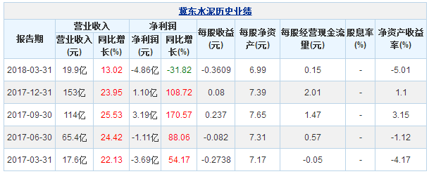 冀東水泥4月20日最新公布的2018年一季報顯示,其營業(yè)收入19.9億元,同比增長13.02%;歸屬于上市公司股東的凈利潤-4.86億元,同比下降31.82%。