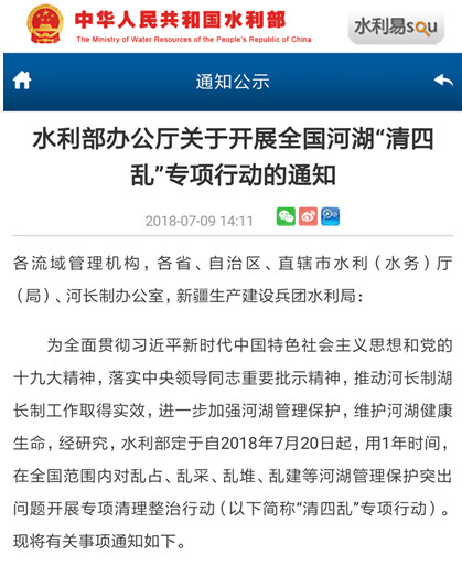 7月9日水利部辦公廳發(fā)布《關(guān)于開展全國河湖“清四亂”專項(xiàng)行動(dòng)的通知》。通知稱水利部定于自2018年7月20日起,用1年時(shí)間,在全國范圍內(nèi)對(duì)亂占、亂采、亂堆、亂建等河湖管理保護(hù)突出問題開展 “清四亂”專項(xiàng)行動(dòng)。