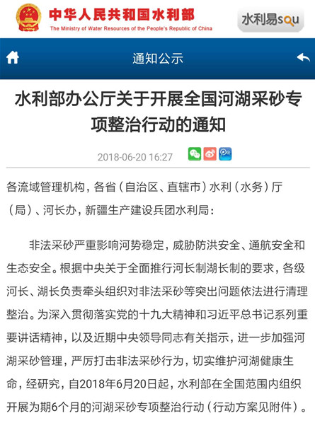 6月20日水利部辦公廳還曾發(fā)布一個(gè)《關(guān)于開展全國河湖采砂專項(xiàng)整治行動(dòng)的通知》通知稱非法采砂嚴(yán)重影響河勢(shì)穩(wěn)定,威脅防洪安全、通航安全和生態(tài)安全。根據(jù)中央關(guān)于全面推行河長制湖長制的要求,各級(jí)河長、湖長負(fù)責(zé)牽頭組織對(duì)非法采砂等突出問題依法進(jìn)行清理整治。