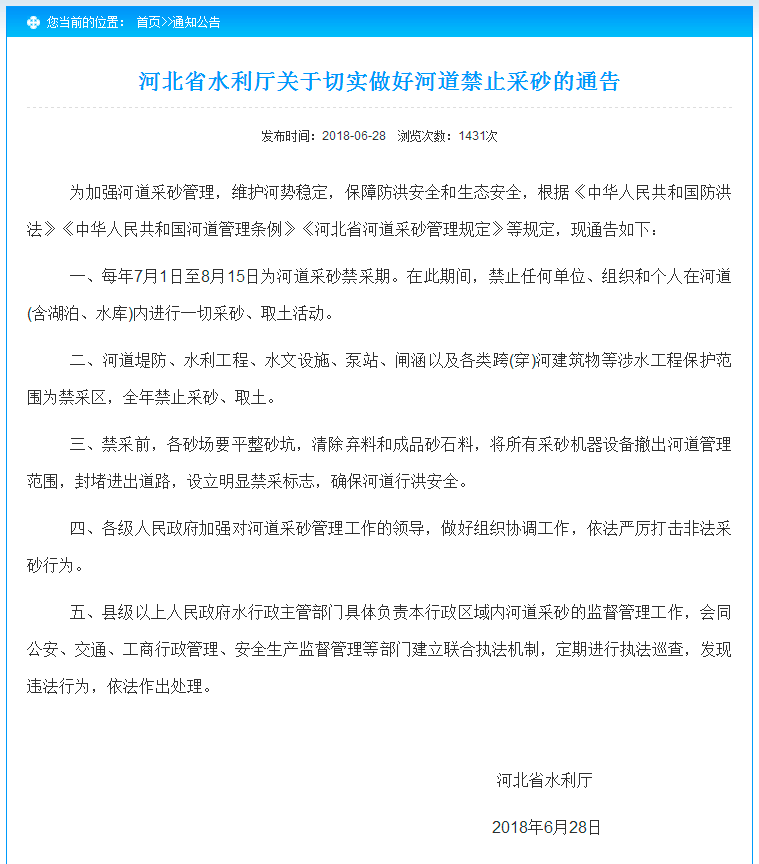 6月28日河北省水利廳發(fā)布《關(guān)于切實(shí)做好河道禁止采砂的通告》,該通告提出,每年7月1日至8月15日為河道采砂禁采期。在此期間,禁止任何單位、組織和個(gè)人在河道(含湖泊、水庫)內(nèi)進(jìn)行一切采砂、取土活動(dòng)。